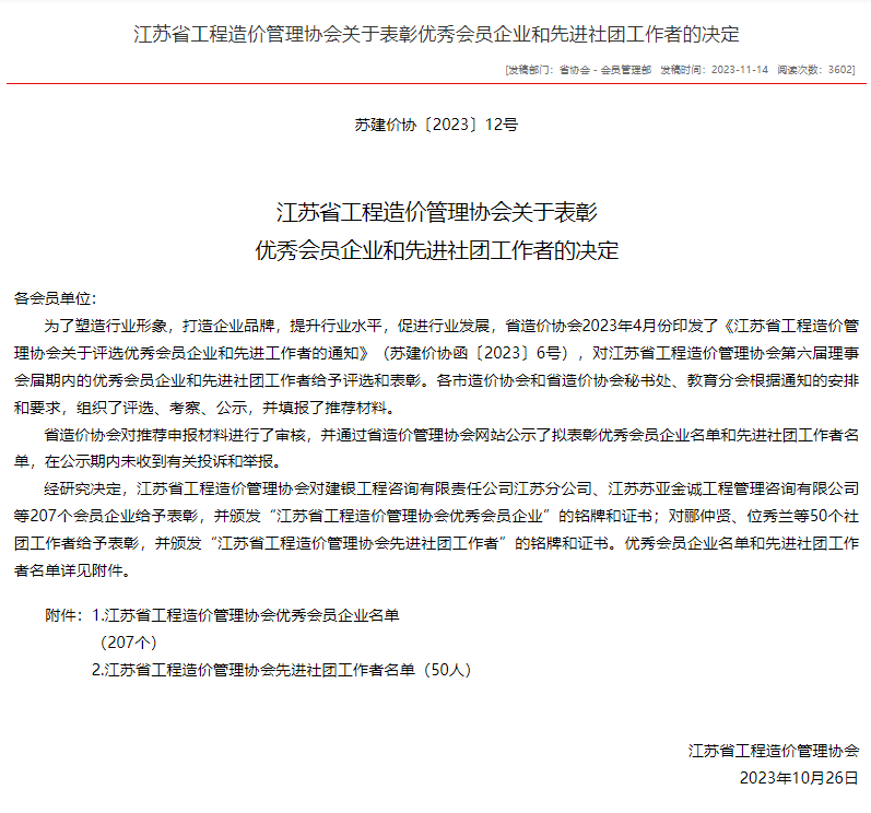 祝賀公司成為江蘇省工程造價(jià)管理協(xié)會(huì)優(yōu)秀會(huì)員企業(yè)/祝賀公司總工辦同事嚴(yán)勤芳成為江蘇省工程造價(jià)管理協(xié)會(huì)先進(jìn)社團(tuán)工作者